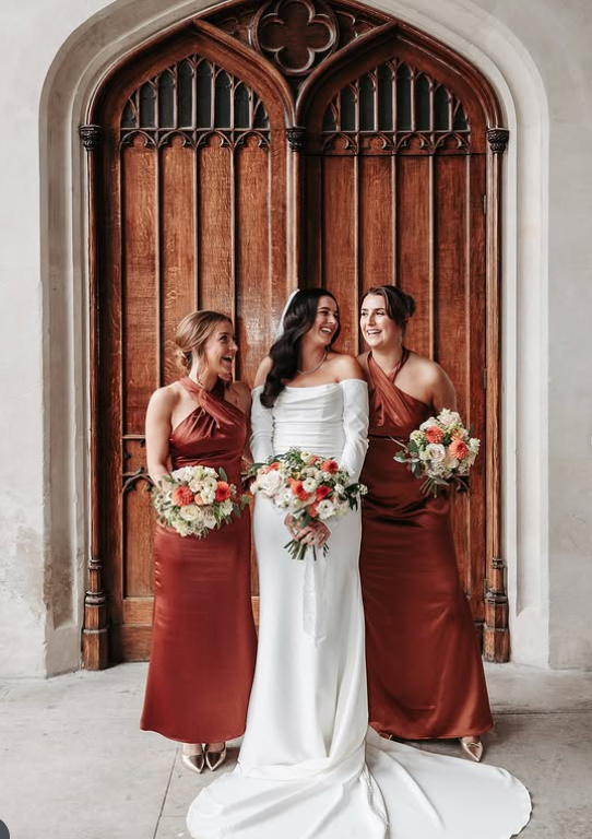 The bride radiates elegance in a classic off-the-shoulder white gown while her bridesmaids complement her look in stunning rust-colored satin dresses.