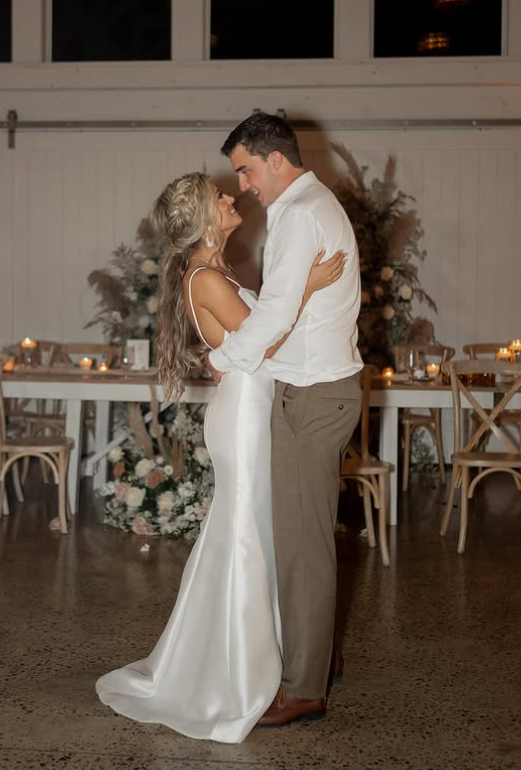 Her sleek satin gown and his relaxed, classic look create a modern yet romantic vibe—perfect for an intimate October wedding celebration.