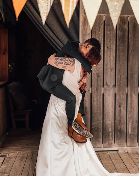 A joyful and emotional moment as the couple embraces tightly, capturing the excitement of their wedding day.