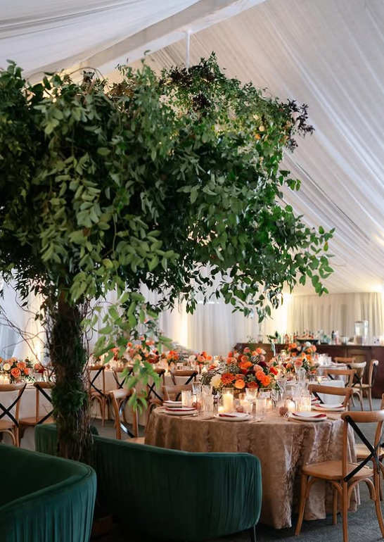 The tables are dressed in soft, textured linens and decorated with glowing candles and vibrant orange floral arrangements — a warm and elegant palette perfect for a dreamy fall celebration.