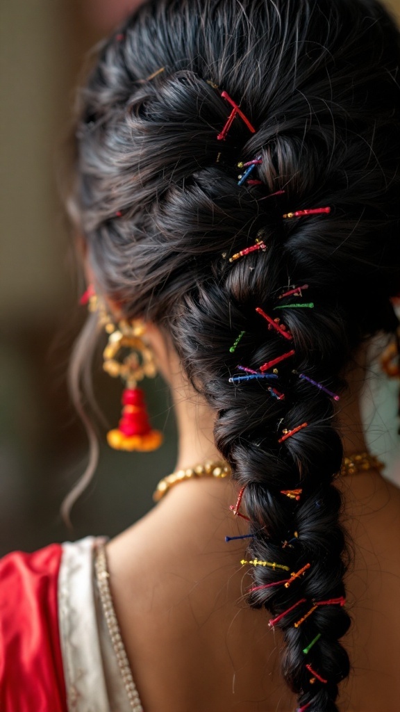 The image showcases a beautiful braid adorned with colorful threads. These threads add a playful touch, bringing out the celebratory spirit of the occasion. It’s a simple yet eye-catching way to enhance the look.
