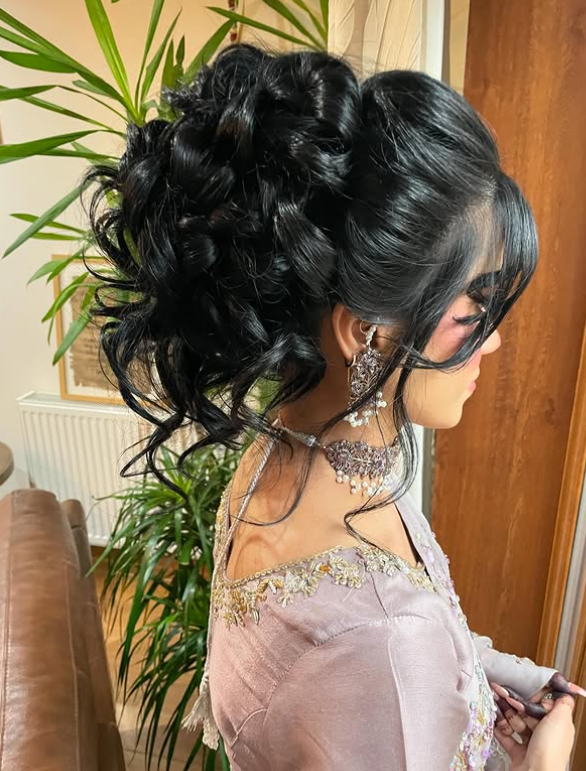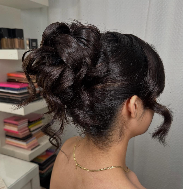 A dramatic curly bun with soft volume and delicate face-framing strands, perfect for bridesmaids who want a bold yet elegant hairstyle that enhances any wedding look.