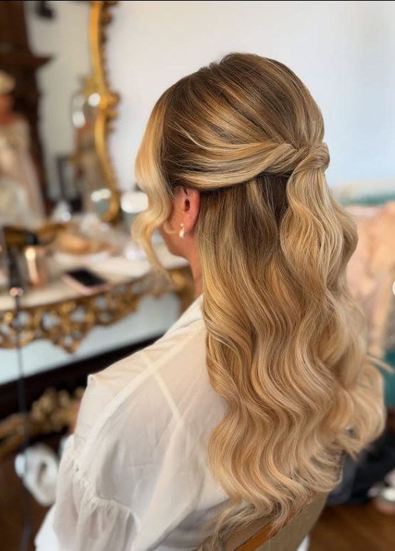A chic half-up style with smooth volume at the crown and cascading waves, creating a glamorous yet simple bridesmaid hairstyle that shines in both classic and modern weddings.