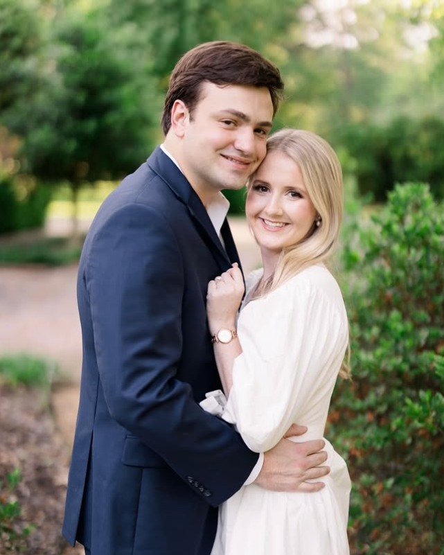 With soft outdoor lighting and elegant outfits, it beautifully conveys joy, warmth, and togetherness.