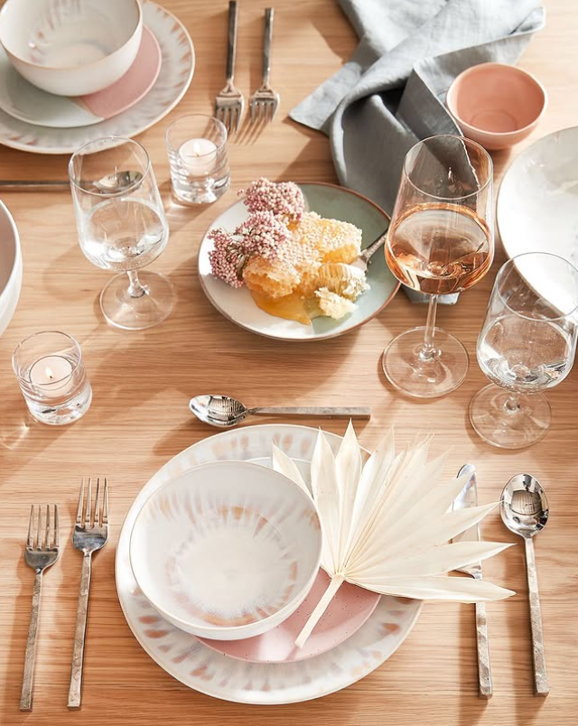 This fresh and inviting tablescape showcases registry must-haves like chic dinnerware, glassware, and cozy table lamps that create a welcoming atmosphere.