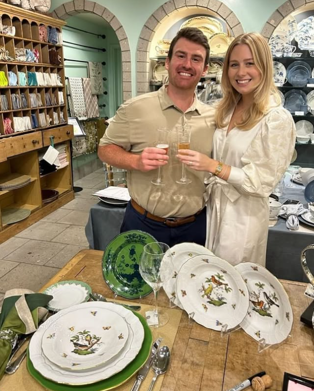 This joyful couple celebrates while curating their wedding registry with timeless china and elegant tableware.