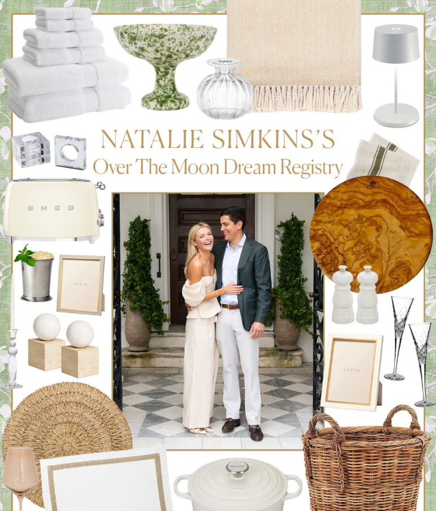 A beautifully curated wedding registry mood board featuring timeless essentials like luxury linens, chic tableware, modern kitchen appliances, and elegant home décor.