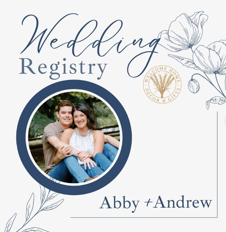 A beautifully designed wedding registry cover featuring Abby and Andrew’s photo framed in a modern circular border with elegant floral sketches.