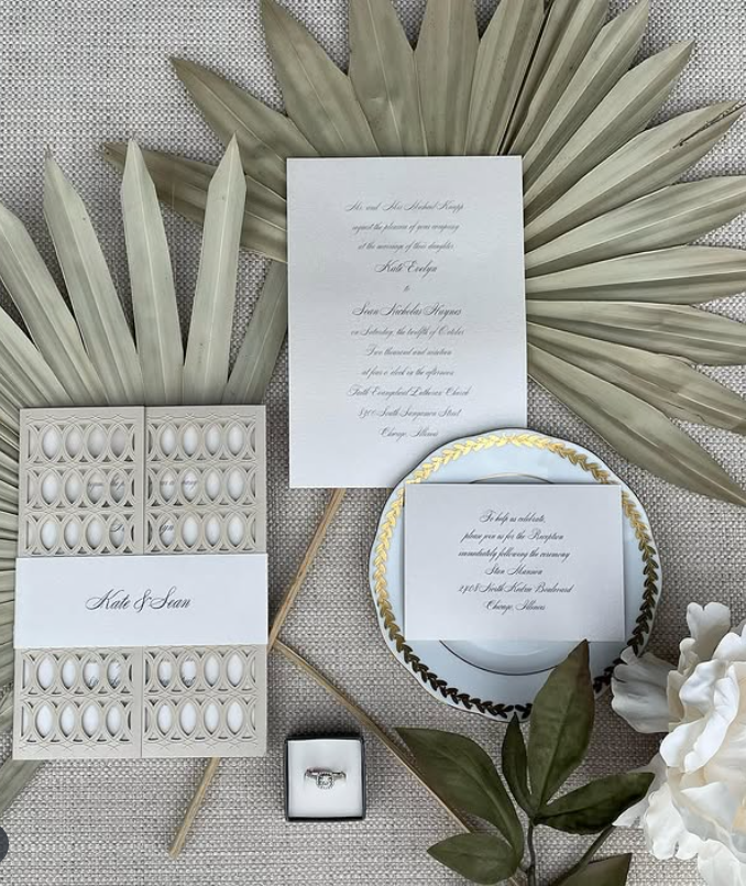 A sophisticated flat-lay of a wedding invitation suite styled with neutral-toned palm leaves, fine china, and a delicate engagement ring.