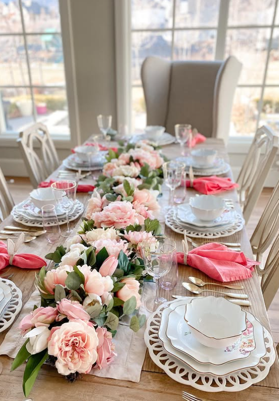 This beautifully arranged dining table features delicate white dinnerware, scalloped chargers, and romantic pink floral accents, creating a warm and inviting atmosphere.