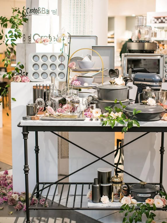 This chic kitchen display highlights must-have registry picks, from sleek cookware and glassware to modern appliances.