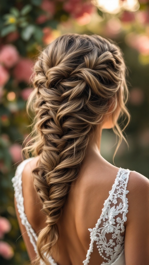 The image showcases a beautiful waterfall braid, with cascading strands that create a soft, ethereal vibe. The braiding technique allows some hair to fall freely, resembling a gentle waterfall. This playful look works well with floral backdrops, making it perfect for outdoor weddings.