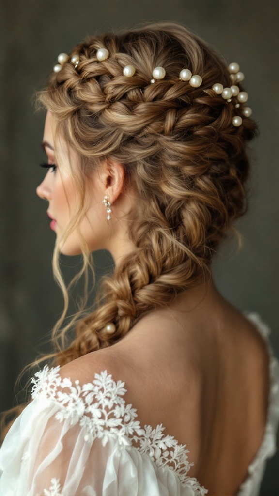 Pearls add a lovely detail to the style, giving it a timeless and sophisticated touch. They catch the light and enhance the overall look, making it feel special and cherished. This hairstyle can be perfect for various wedding themes, from bohemian to classic.