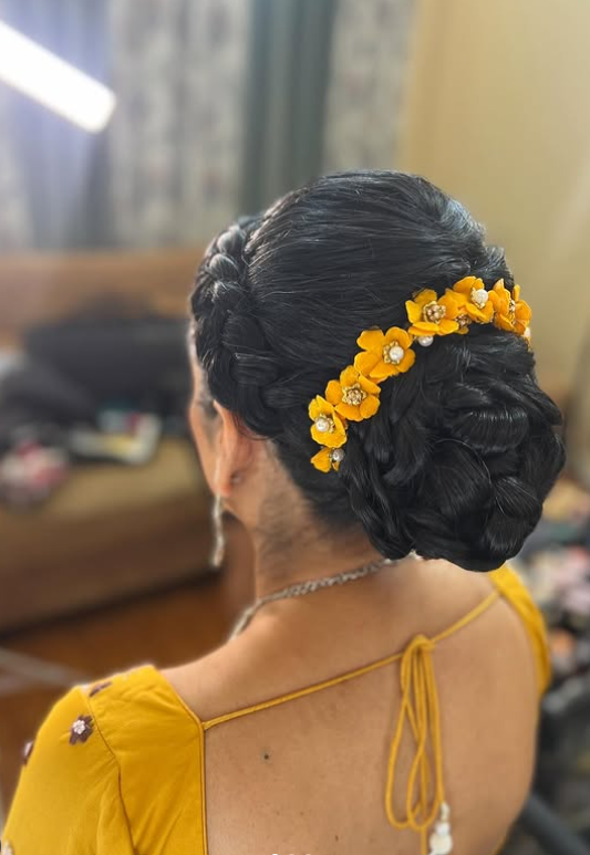 A polished braided bun adorned with bright floral accessories, creating a bold and elegant bridesmaid hairstyle that’s perfect for festive and vibrant wedding celebrations.