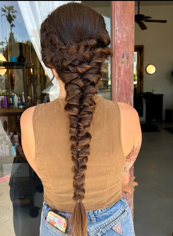 A beautifully detailed fishtail braid that flows into an elegant updo style, giving bridesmaids a bold and unique look that’s perfect for modern or boho-inspired weddings.