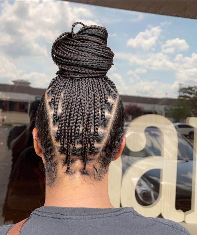 A chic high bun created with small, neat braids, giving bridesmaids a sleek and stylish updo that combines tradition with modern elegance.