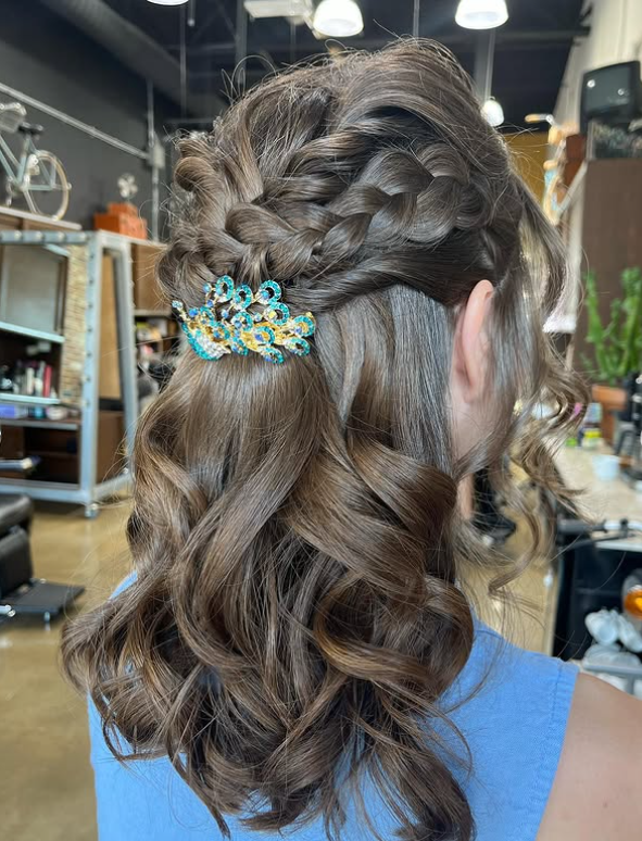 A soft braided half-updo paired with loose curls, finished with a sparkling jewel clip for a touch of elegance.