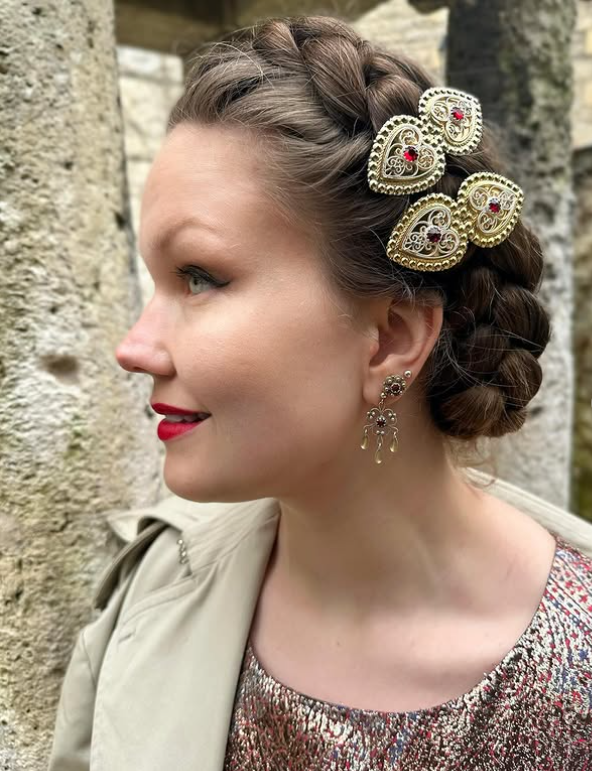 A sophisticated braided crown elevated with ornate gold clips featuring jewel accents.