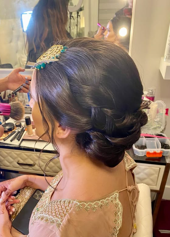 In the image, you can see a beautifully crafted updo. The hair is styled in a smooth, twisted braid that forms a lovely bun at the back. Delicate hair accessories, like small pearls, add a subtle sparkle, enhancing the overall appearance without overwhelming it.