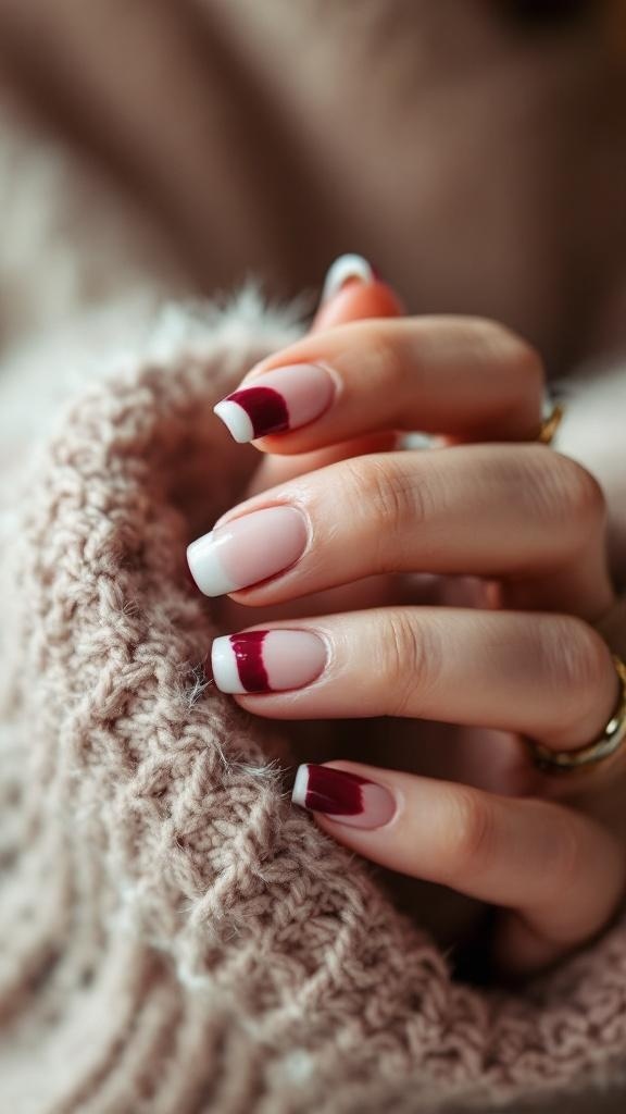 The design is simple yet elegant, allowing for easy maintenance while still making a statement. You can easily achieve this look at home or at your favorite salon. Just grab your favorite cherry wine polish and a nude shade, and you’re ready to go!