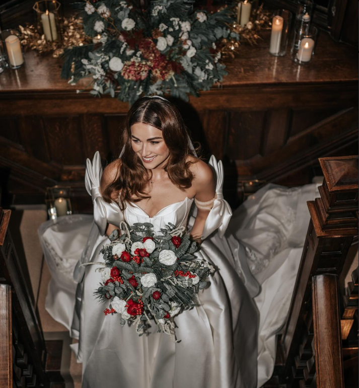This stunning bride captures the magic of winter with a satin gown paired with a festive bouquet of red and white roses, accented by lush evergreens.