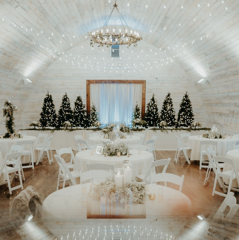 Snow-dusted Christmas trees, twinkling fairy lights, and elegant white florals create a cozy yet sophisticated atmosphere.