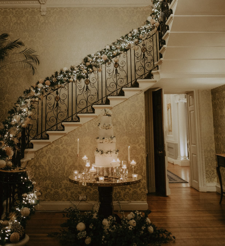 A breathtaking winter wedding setup featuring a tall white cake adorned with delicate florals, perfectly staged beneath a grand staircase wrapped in sparkling garlands and glowing candles.
