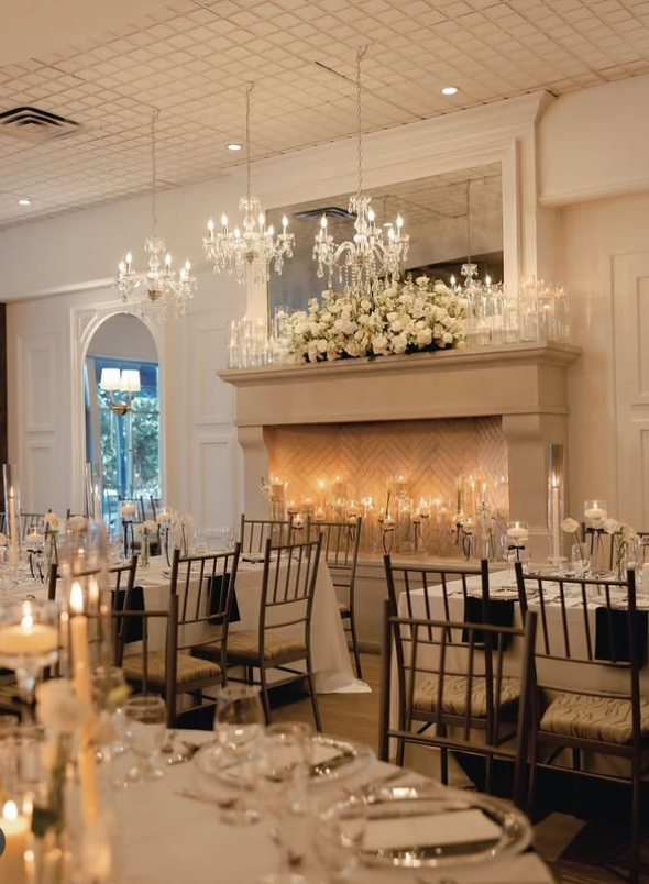 This winter wedding reception exudes timeless elegance with a warm fireplace centerpiece, sparkling chandeliers, and soft candlelight.