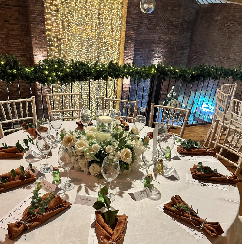 The warm glow of fairy lights cascades against exposed brick, while lush white florals and greenery add a seasonal touch.