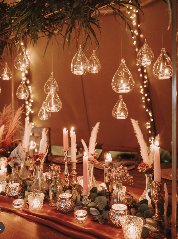 This stunning winter wedding setup exudes warmth and elegance with its glowing candles, delicate glass holders, and whimsical hanging lights.