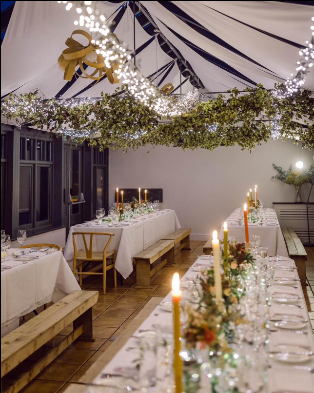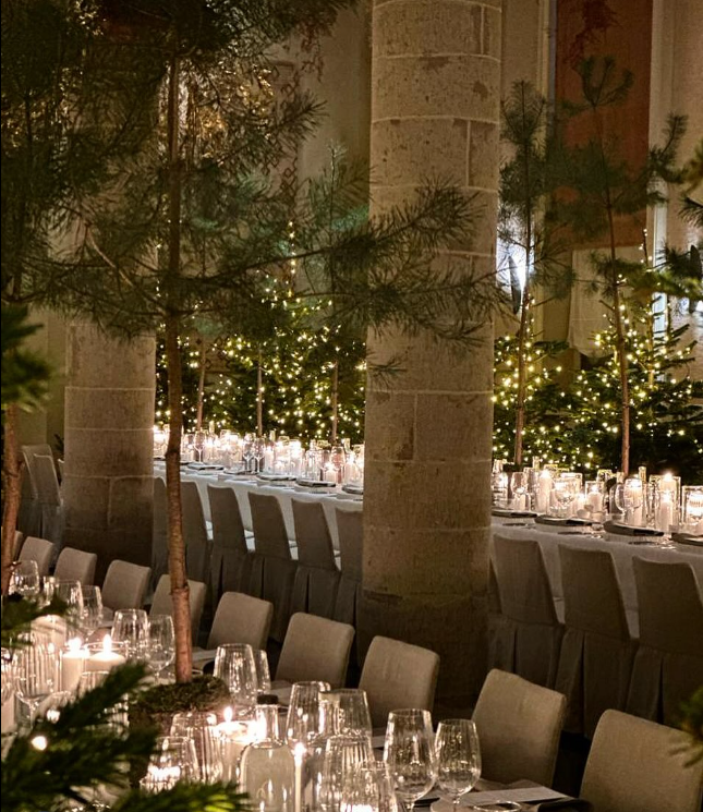 Long banquet tables lined with elegant glassware, deep-toned linens, and fresh greenery add sophistication, while warm lighting ties everything together for a cozy winter celebration that feels both stylish and inviting.
