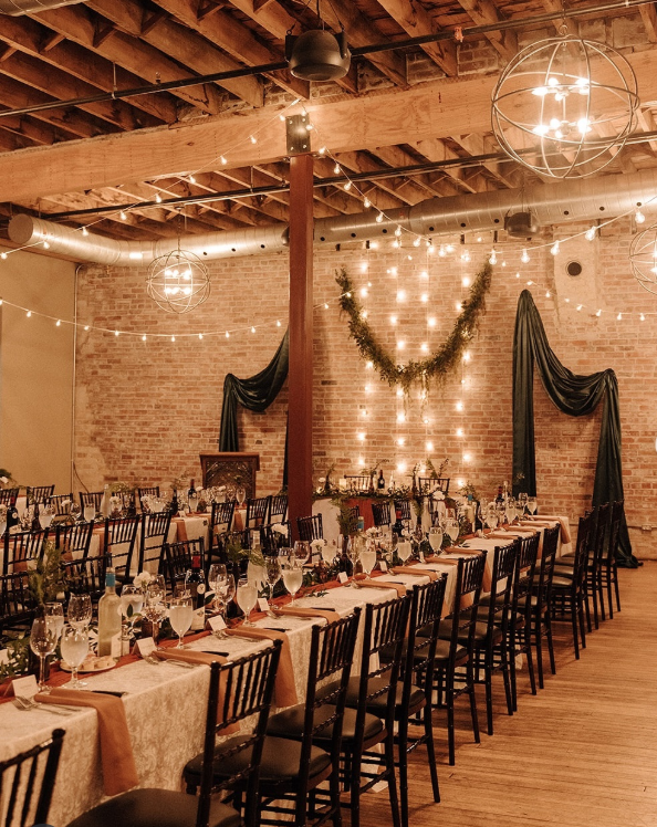 This winter wedding reception blends rustic-industrial vibes with festive warmth.