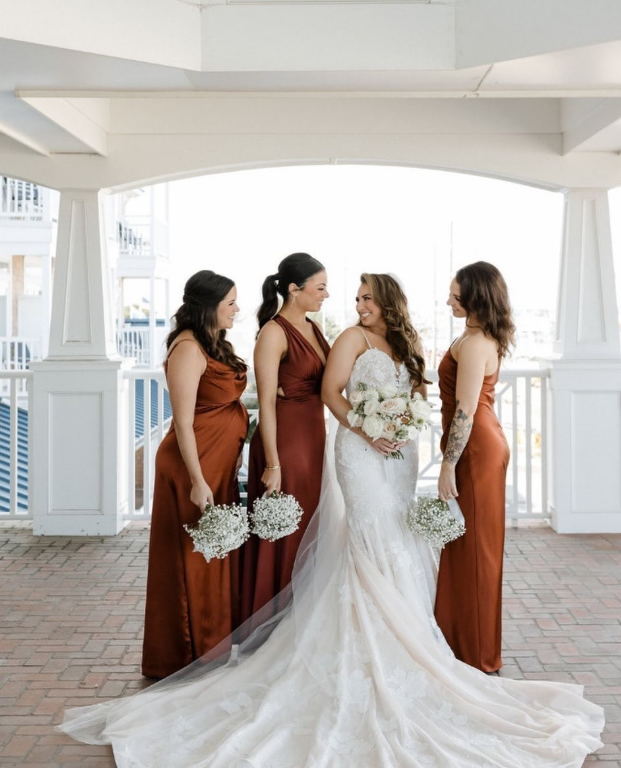 Surrounded by bridesmaids in rich copper satin dresses holding bold fall bouquets, this look captures the warm, vibrant beauty of an autumn wedding.