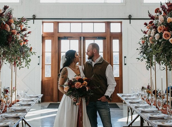 Her bouquet of rich burgundy, peach, and burnt orange tones ties beautifully with the cozy barn-style décor, creating a warm and inviting fall atmosphere.