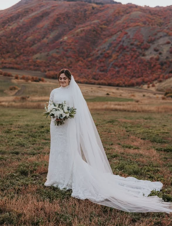 Holding a bouquet of seasonal blooms, she embodies the romance and warmth of a dreamy fall wedding.