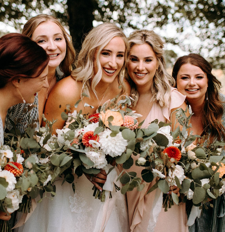 Surrounded by bridesmaids in terracotta and rust-toned dresses, this fall wedding party captures the warmth and beauty of the season.