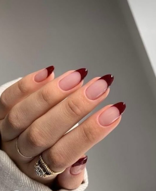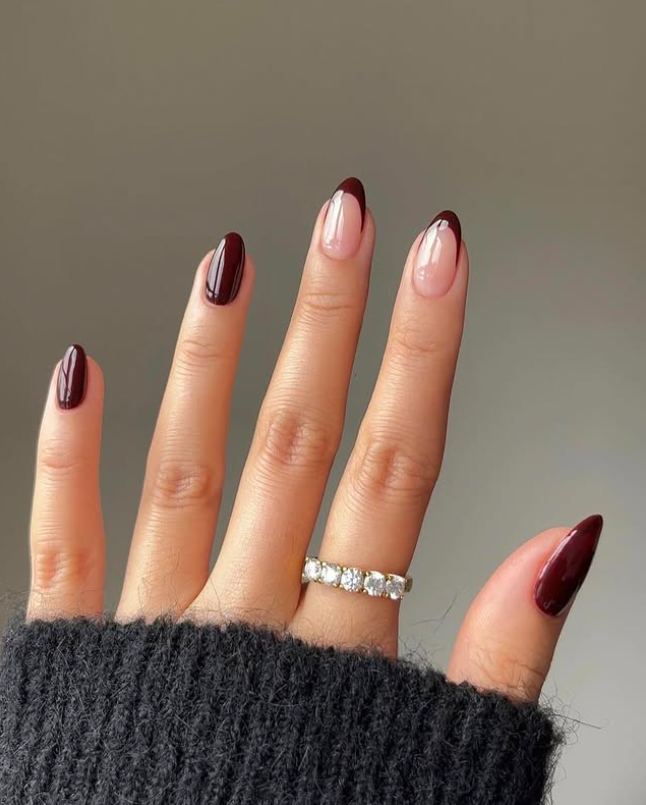 A chic twist on the classic French manicure, these nails feature deep burgundy tips paired with a nude base for a refined and timeless look.