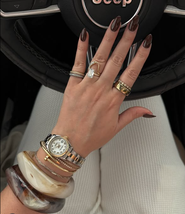 These glossy dark chocolate nails are the perfect sophisticated pick for a fall wedding.