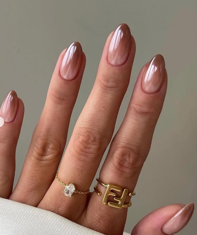 These glossy nude chrome nails are the epitome of elegance, adding a subtle shimmer that catches the light beautifully.