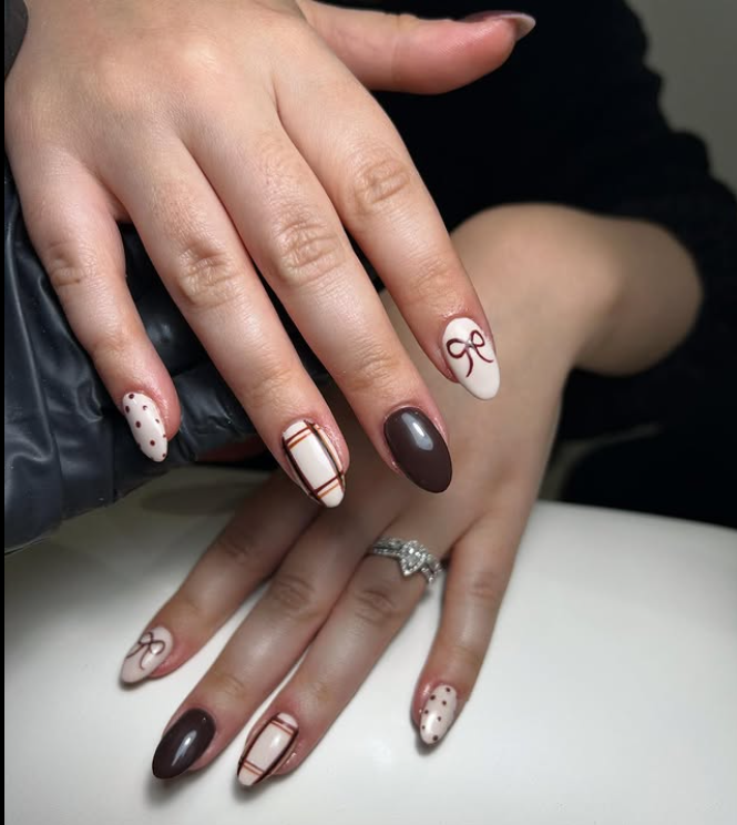 These brown and cream nails with plaid, bows, and polka dot details add a whimsical yet chic touch to any fall wedding look.