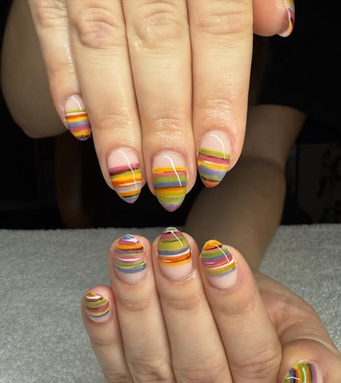 These vibrant striped nails bring a playful twist to fall wedding style.