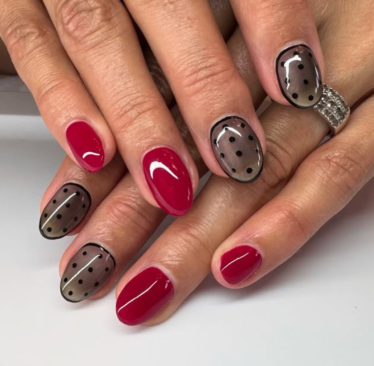 These fall wedding nails mix bold red polish with sheer black polka dot accents for a chic and playful vibe.