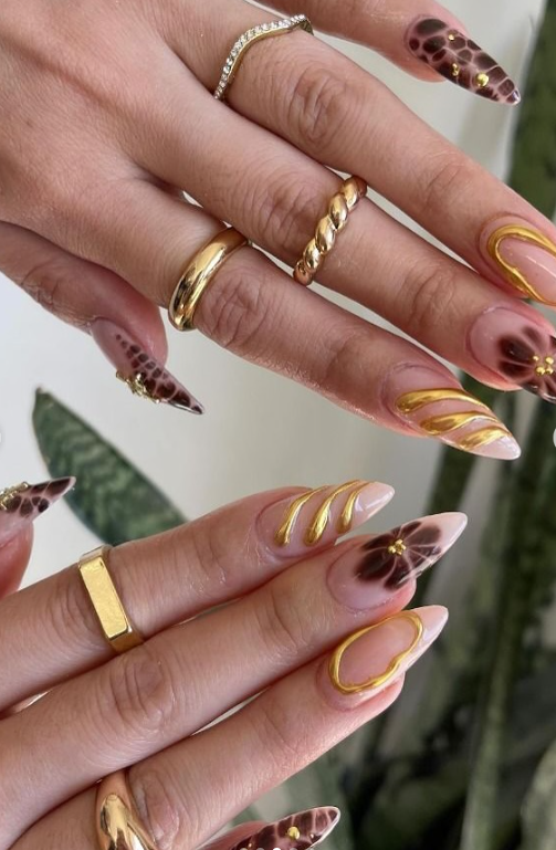 These elegant fall wedding nails feature rich brown floral accents paired with striking gold swirls and heart details.