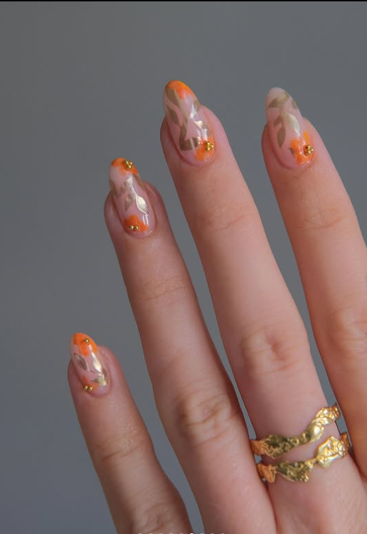 These nails capture the essence of fall with delicate leaf patterns in warm earthy tones and pops of burnt orange.