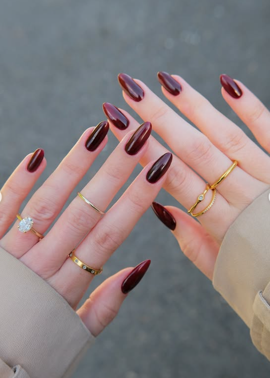 These glossy burgundy almond-shaped nails are the perfect fall wedding choice, bringing richness and elegance to your bridal look.