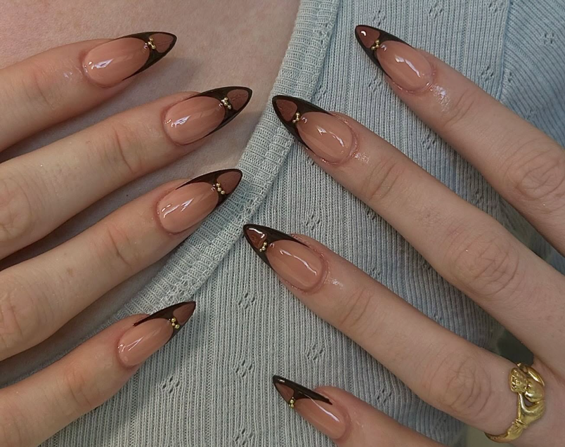These glossy nude nails with deep brown French tips and delicate gold bead accents are a stunning choice for fall weddings.