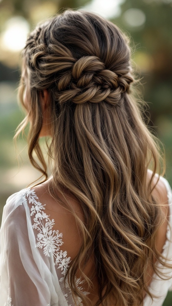 The image shows a lovely example of this style. The hair is elegantly twisted at the back, creating a soft, textured look. Loose waves cascade down, framing the face nicely. This hairstyle is perfect for a wedding, providing a balance between sophistication and ease.