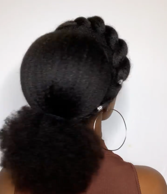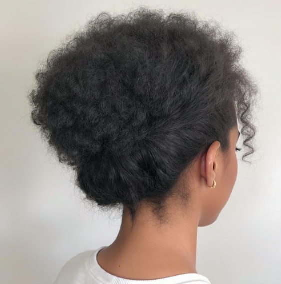 The high-volume low bun with an afro puff is a stunning hairstyle that combines elegance with a playful touch. This look showcases the beauty of natural hair while keeping it stylish and manageable.