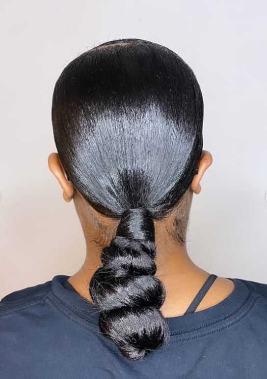 This sleek low ponytail bun with a twisted finish is a chic and modern hairstyle for Black women.