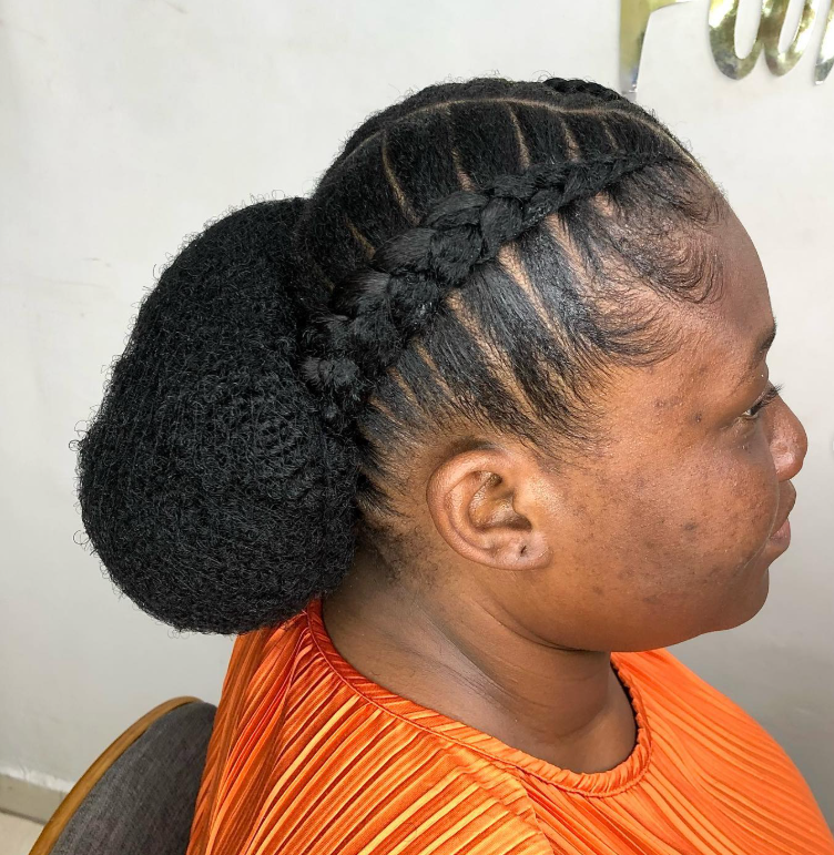 The afro puff adds a delightful volume at the crown, creating a striking contrast with the sleek low bun at the nape of the neck. This hairstyle is perfect for any occasion, whether you’re heading to work or going out with friends.
